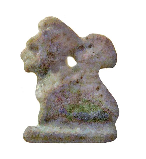 Amuleto in faience lavorato a tutto tondo in modo alquanto stilizzato, raffigurante un gatto dalle grandi orecchie seduto su una piccola base; all'altezza del collo vi è un foro passante.