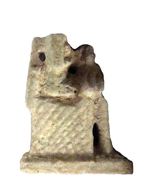 Amuleto in faience raffigurante Iside seduta su un trono a basso schienale, raffigurata nell’atto di allattare il figlioletto Horus, disteso sulle sue ginocchia. I piedi poggiano su una piccola base ed è presente un foro all'altezza della schiena. Purtroppo la testa della dea è spezzata.