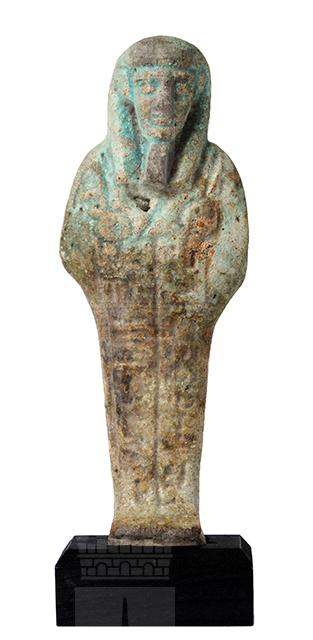 Statuina funeraria mummiforme, con le mani incrociate sul petto, che reggono una zappa ciascuna. L'ushabti porta una parrucca tripartita e la barba divina. Sono presenti la base sotto i piedi e il pilastro dorsale. Lungo il corpo, nella parte anteriore, sono presenti due colonne di iscrizione geroglifica, purtroppo illeggibili.