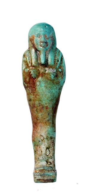 Statuina funeraria mummiforme che indossa la parrucca tripartita e la barba divina. Le braccia sono incrociate sul petto, le mani sono affiancate: nella sinistra c'è una zappa e nella destra un piccone. Sul dorso si vede il pilastro dorsale che forma un tutt'uno con la piccola base quadrangolare. L'ushabti è anepigrafe.