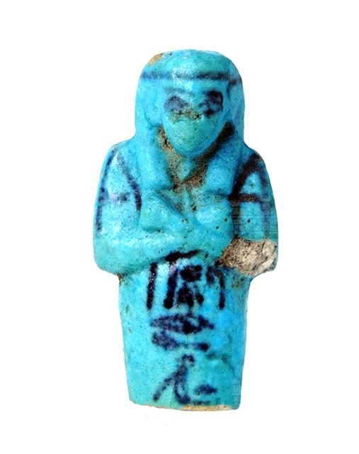 Frammento superiore di statuina funeraria mummiforme che indossa la parrucca tripartita con il seshed. Le braccia sono incrociate sul petto, la destra sulla sinistra, e le mani reggono entrambe una zappa. Sulla schiena pende una sacca per sementi. Sotto le braccia parte la colonna di iscrizione, purtroppo mutila a causa della frattura. Tutti i dettagli sono resi con dipintura in nero.