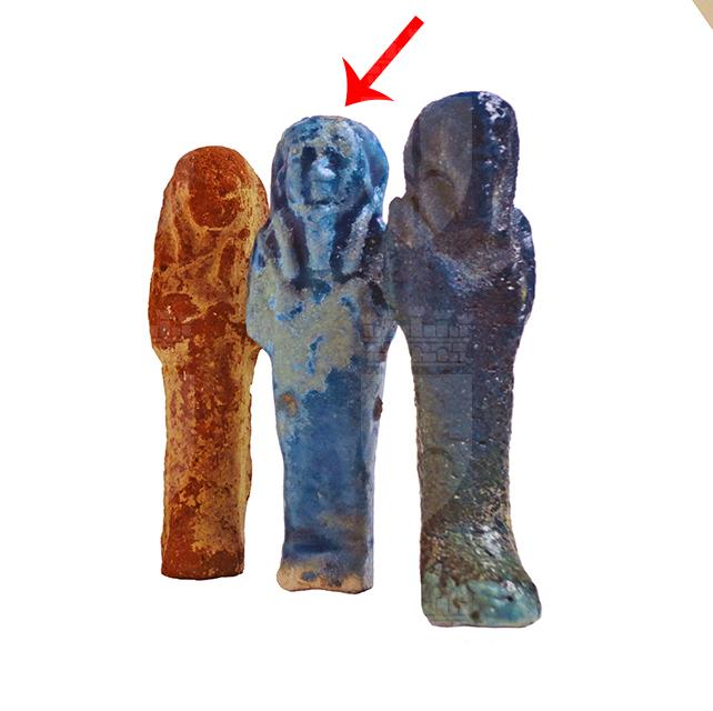 Statuina funeraria mummiforme che indossa la barba divina e una gonfia parrucca tripartita, la quale nella parte posteriore è stata rifinita, ma risulta comunque piatta. Le braccia sono incrociate e le mani portano ognuna una zappa. L’ushabti è privo di iscrizioni ed è probabile che sia servito come amuleto.