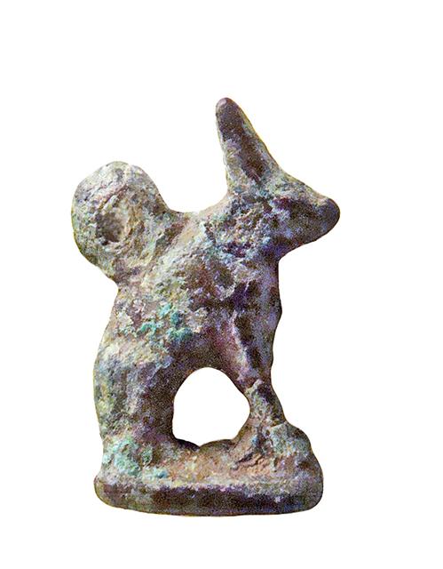 Amuleto in faience lavorato a tutto tondo con numerose incrostazioni superficiali che rendono difficile la determinazione precisa del materiale. Raffigura un gatto dalle grandi orecchie seduto su una piccola base; sul dorso vi è un anello di sospensione.