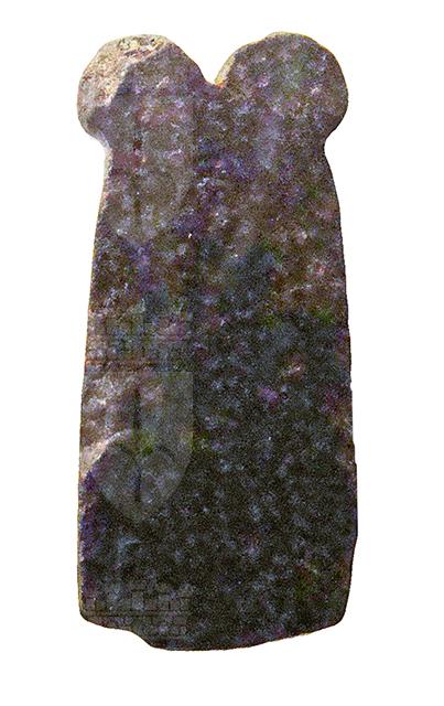 Amuleto in pietra, bidimensionale, che raffigura la silhouette di una coppia di piume di struzzo disposte simmetricamente e riconoscibili per la sommità tondeggiante e rigonfia, mentre la base è insolitamente diritta. L'amuleto è privo di foro per la sospensione. La piuma di struzzo singola era l'emblema della dea Maat, garante della verità e della giustizia.