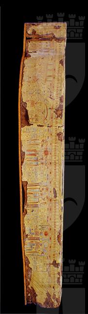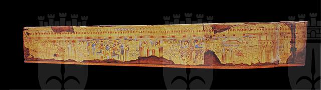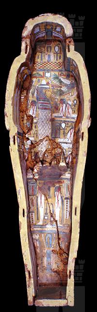 La moltitudine delle immagini, distribuite in vignette alternate a colonne di geroglifici, così come i testi stessi, ripropongono il culto del dio Osiride e del sole, affermando l’idea del viaggio eterno dell’astro, a cui la defunta partecipa essendo ella stessa una parte del grande dio. Puntuali confronti con sarcofagi custoditi presso il Museo nazionale di Napoli, il British Museum e il Petrie Museum di Londra, evidenziano la sua appartenenza al gruppo dei cosiddetti “yellow coffins”, datato alla fine della XXI dinastia e in uso particolarmente nell’ambito della casta sacerdotale di Amon a Tebe. Si tratta di un sarcofago femminile, come è dimostrato dai seni, riconoscibili sotto le bande della parrucca, dalla particolare lunghezza di queste ultime, dal fatto che le orecchie non sono visibili e dal colore del volto. I testi geroglifici della cassa non riportano il suo nome (a meno che non si trovasse nella porzione ormai illeggibile del testo del coperchio) e questa circostanza, riscontrata anche in altri esemplari simili, risulta essere un’altra caratteristica della fine della XXI dinastia. La proprietaria fu probabilmente una sacerdotessa di Amon vissuta nella zona tebana.