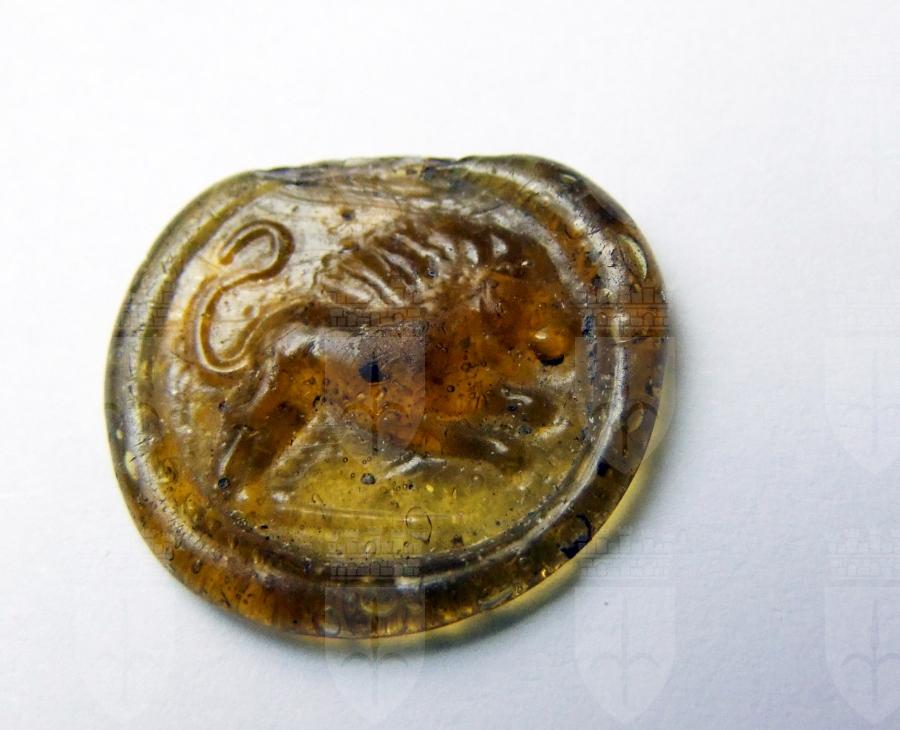 Forma circolare; bordo rilevato; appiccagnolo spezzato. Decorazione data da leone in corsa a ds.