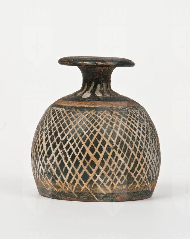 Alabastron “a calamaio” a vernice nera con sovraddipinture in bianco crema e giallo ocra. Labbro a tesa discoidale dal profilo leggermente convesso, orlo estroflesso, collo slanciato a profilo cilindrico, spalla distinta convessa, corpo troncoconico, fondo quasi completamente piatto. Sul collo sequenza di bastoncelli verticali, sulla spalla fascia in giallo ocra, sul corpo motivo a reticolo con maglie romboidali sovraddipinto in bianco, inquadrato superiormente e inferiormente da fasce, quella superiore, più sottile, in bianco, quella inferiore, più spessa, in giallo (copre anche parzialmente il reticolo).