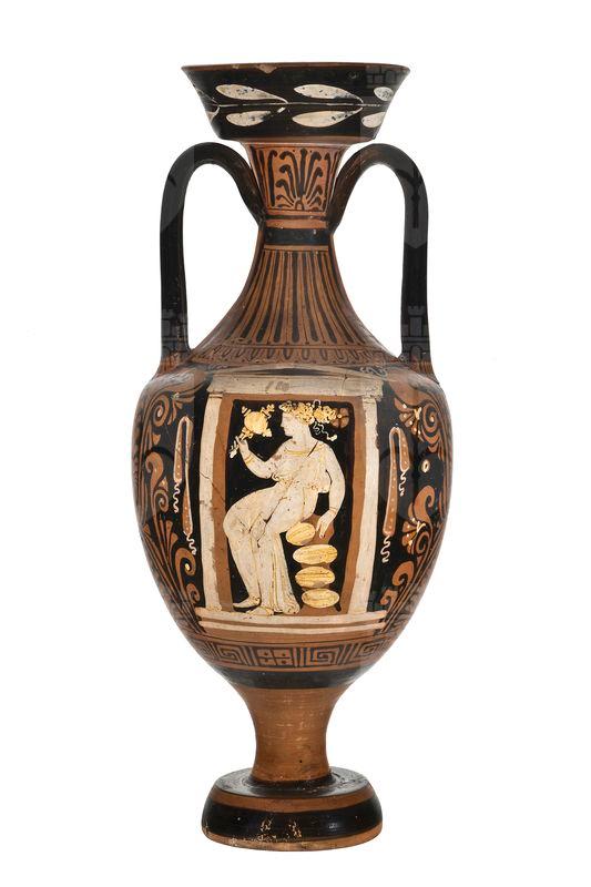 Anfora panatenaica a figure rosse con elementi sovradipinti in bianco e giallo. Alto labbro svasato; collo stretto; breve spalla arrotondata; corpo ovale; alto stelo su ampio piede troncoconico; anse a nastro impostate fra il centro del collo e la spalla. Sul labbro ramo d'alloro; palmette sovrapposte fra girali con foglie; inferiormente meandro interrotto da rettangoli con croce e puntini. Lato A: defunta in chitone seduta su roccia all'interno di un'edicola con specchio in mano. Lato B: scena di offerta: donna stante con phiale e serto a corona.