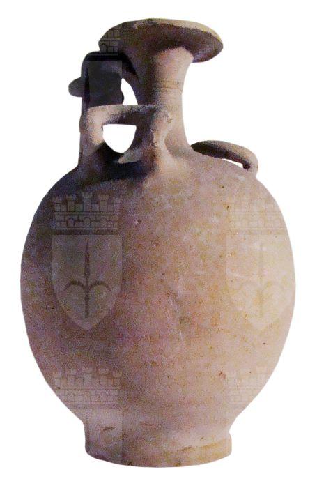hydria con corpo globulare, alto e sottile collo cilindrico, con labbro a profilo diritto e orlo appiattito, con due piccole anse a nastro impostate verticalmente sulla spalla e un’ansa impostata tra l’orlo e la spalla, decorata con nastro, piede troncoconico a profilo diritto.