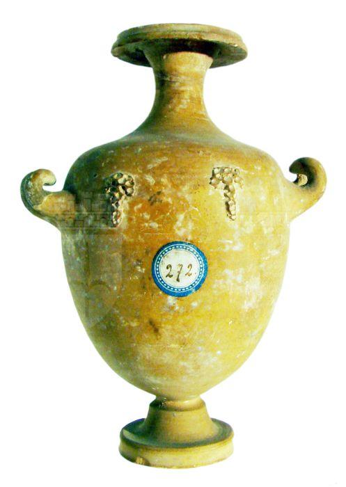 hydria con bocchello troncoconico leggermente svasato, collo a profilo concavo, spalla arrotondata, corpo globoso, piede ad anello modanato con gola d’attacco. Sulla parte anteriore del corpo, due piccoli grappoli d’uva applicati. Tracce di vernice rosso-arancio sull’orlo, su quasi tutto il corpo e il piede.