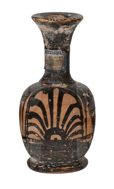 Lekythos attica a figure rosse con palmetta ad antefissa.