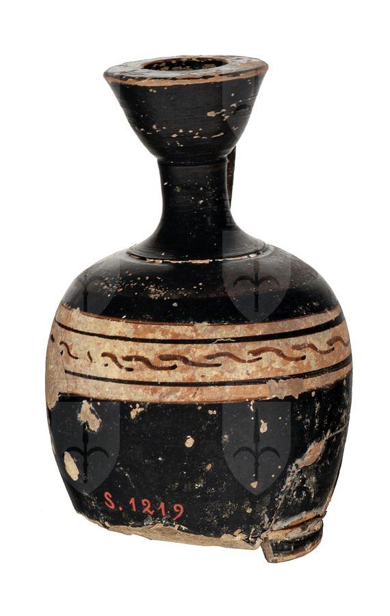 Lekythos miniaturistica a corpo globulare attica con tre fasce a risparmio e nella centrale decorazione a meandro