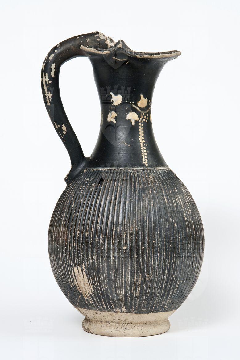 Oinochoe a vernice nera con sovraddipinture in bianco e giallo. Labbro modanato, orlo estroflesso e trilobato, collo a profilo concavo, corpo globulare strigilato, ansa a bastoncello verticale desinente alla sommità, nel punto d’attacco all’orlo, in una protome ferina/leonina, piede ad anello. Sul collo: tralcio di edera a pergolato con stelo sinuoso dipinto e rosette di punti in giallo, da cui pende un ramo secco con foglie puntiformi.