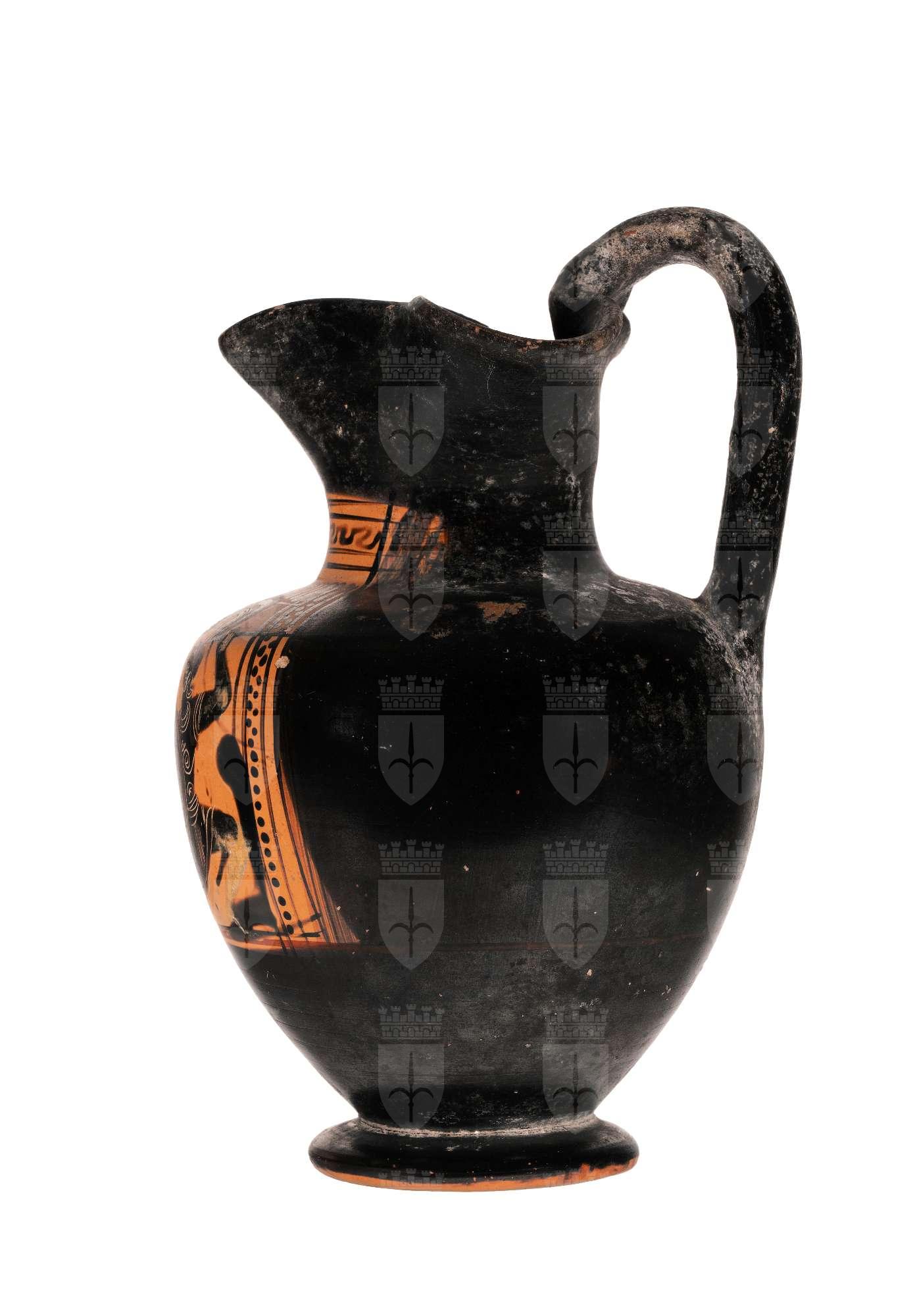 Oinochoe a figure nere con colori aggiunti e graffito: scena di Eracle che combatte contro una amazzone. Eracle, con indosso tunica, pelle di leone e schinieri, armato di clava aggredisce una amazzone, che piegata sul ginocchio sinistro, armata di elmo attico, corazza e schinieri, brandisce la lancia e uno scudo rotondo con al centro una gamba umana. Lo sfondo roccioso è reso a macchie indistinte.
