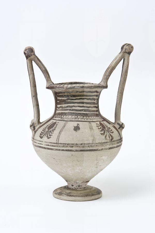 Trozzella in ceramica messapica. Orlo estroflesso e appiattito, alto collo cilindrico, a profilo leggermente concavo, corpo globoso, con anse verticali sormontanti, impostate sull’orlo e sulla spalla, provviste di doppia coppia di dischi (“trozze”), di cui quelli superiori sono di maggiori dimensioni; piede a disco, unito al corpo mediante un piccolo fusto. Decorazione monocroma in bruno su fondo naturale di argilla, con piede dipinto; risparmiata la costa laterale del piede; sul collo, linee orizzontali diritte e motivo a reticolo in quella inferiore; sulla spalla, una serie di pannelli definiti da linee parallele, in cui su un lato campeggiano due palmette laterali e un’anfora al centro, mentre sull’altro un ramo di ulivo. All’altezza del ventre, una fascia a tre linee parallele; sul fusto del piede, fasce e una linea; sull’orlo, tratti; sui dischi linee radiali.