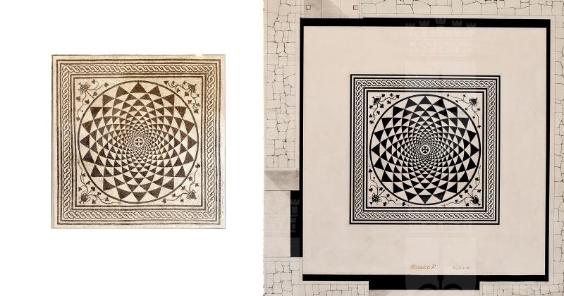 Mosaico completo rimontato dagli (otto pannelli) del mosaico della seconda fase edilizia e appartenuto al cubicolo (stanza da letto) A’, del lato orientale del peristilio, che aveva questo pavimento a mosaico bianco nero con disegno a rosone, formato da una serie di triangoli neri incurvati e restringentisi verso il centro, costituito da un fiore a quattro petali bianco su fondo nero; negli angoli sono quattro cantari (vasi), di diversa forma, da cui spuntano rami e fogliette d’edera. La cornice ha una treccia continua tra due fasce bianche delimitate da linee nere. Il riquadro era inserito in una larga fascia bianca con bordo nero alle pareti.