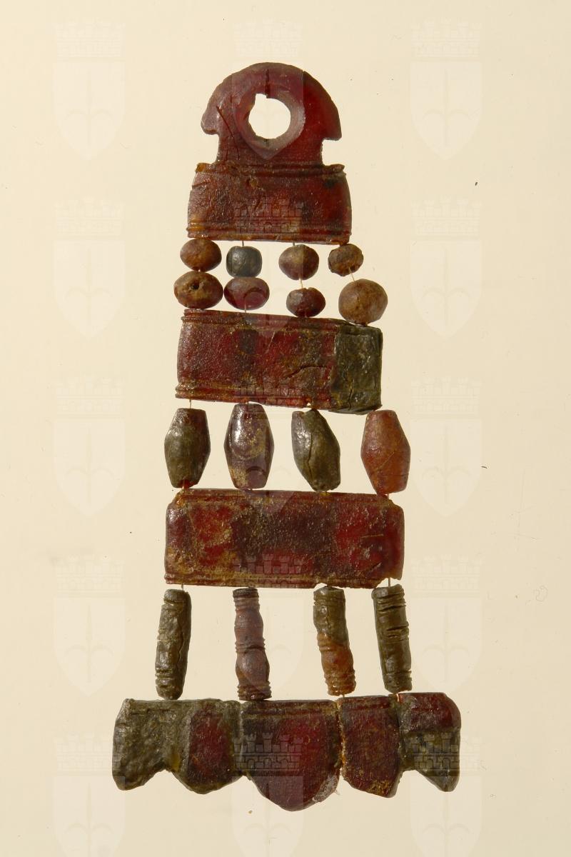 Pendente a piccolo pettorale in ambra formato da quattro passanti a piastrina rettangolare, decorati da doppie file incise orizzontali sui lati lunghi, di misura crescente verso il basso, ciascuno con quattro fori longitudinali, per i quali passava il filo che collegava le perle. La prima piastrina, sormontata da un appiccagnolo ad anello piatto con un foro centrale, è collegata alla successiva da quattro doppie perline di forma globulare schiacciata; la seconda e la terza sono collegate da quattro perle romboidali a botticella, a la terza e la quarta da perle cilindriche con strozzatura centrale, segnata da incisioni anulari. La quarta piastrina nella parte inferiore termina con cappe triangolari. Il montaggio attuale non corrisponde al disegno realizzato sullo scavo da Carlo Marchesetti.