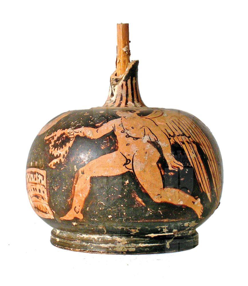 Lechythos apula a figure rosse spezzato. Eros in corsa a sinistra con in mano una corona che destina ad un'ara rettangolare, palmetta sotto l'ansa.