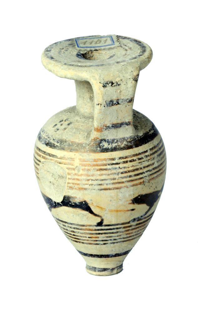 Aryballos piriforme rastremato verso il puntale a fasce con larga zona decorata da tre cani in corsa.