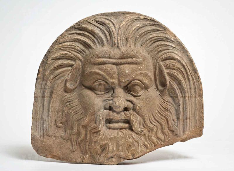 Argilla di colore rossastro, in frattura di color rosato. La bocca, dalle labbra carnose, è aperta, gli occhi ben spalancati, il naso decisamente largo e schiacciato, le sopracciglia corrugate e ben sollevate, la fronte solcata da due profonde rughe orizzontali; le orecchie equine sono poste all'altezza degli occhi, lunghe ciocche di capelli ai lati del viso, la barba è folta.