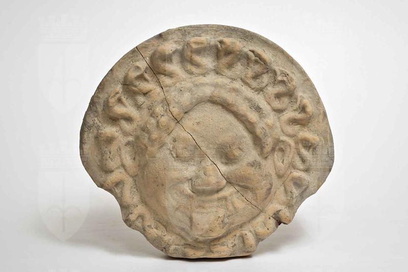 Argilla di color beige, antefissa di forma circolare. Mancante in basso a destra e a sinistra, molto rovinata in superficie. Il coppo corre lungo il bordo superiore ed arriva fino a metà lastra. La testa è circondata da una corona di serpentelli; i capelli formano due file di chioccioline sulla fronte; gli occhi sono allungati ed obliqui; la bocca arcuata e spalancata mostra lingua, zanne e denti.