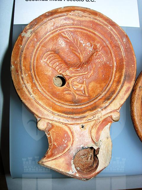 lucerna a volute con becco angolare, sbrecciato sul disco gallo a destra con ramo di palma
