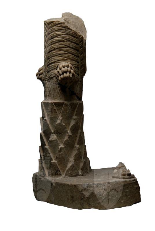 Su un frammento del plinto squadrato rimane parte del piede sinistro di uomo, poggiato su suola, e la base del sostegno raffigurante un tronco di palma dalle grosse squame triangolari nella zona inferiore e lievi arrotondate superiormente; dal tronco emergono due grappoli di datteri disposti su file orizzontali.