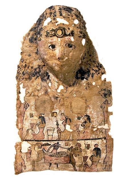 Il pettorale, completato dalla maschera realizzata in rilievo, è realizzato su un supporto di tela, che è stato stuccato e poi dipinto, ottenendo una vivace policromia. Il restauro, realizzato nel 2005, ha ridato forma al volto femminile, molto probabilmente il ritratto della defunta, che era schiacciato e smembrato: circondato da folti capelli neri è comunque poco conservato; si vedono bene gli occhi grandi e si intuisce la forma del naso. Sulla fronte un diadema forse di foglie d’alloro, con medaglione centrale a rilievo. Alle orecchie sono presenti i fori; ciò probabilmente significa che gli orecchini dovevano essere gioielli autentici, a differenza della collana a grani con pendente circolare, che è soltanto dipinta. L’abito della defunta è una tunica con decorazioni sulle spalle, che lascia scoperte le braccia, distese lungo il corpo. Sul petto si riconoscono le zone dov’erano applicati i seni, fatti in rilievo. Al di sotto lo spazio del pettorale è occupato da due scene sovrapposte; in alto tre divinità femminili sono sedute una dietro l’altra, tutte rivolte verso sinistra. Le due esterne hanno testa umana e recano un vaso sulle ginocchia, mentre quella centrale, che sembra avere volto di vacca, reca sulle ginocchia una specie di spiedo e sul capo le corna bovine che racchiudono un disco solare. Dovrebbe pertanto trattarsi della dea Hathor. In basso è raffigurato Anubi nell’atto di completare la mummificazione della defunta, la cui mummia è distesa sul letto funerario a protome leonina, mentre una divinità femminile assiste alla scena. La dea, come quelle raffigurate sopra, ha testa umana, un piccolo disco solare sulla testa e un vaso sulle ginocchia. A completare entrambe le scene vi sono dei vasi come quelli sorretti dalle dee, ma più grandi, oltre a piccoli riquadri colorati, bordati di nero, accanto a ciascuna figura: questi ultimi fanno pensare che si intendessero scrivere, al loro interno, i nomi dei personaggi raffigurati, oppure semplicemente imitano le legende che sempre accompagnano le scene figurate nell’arte egiziana.