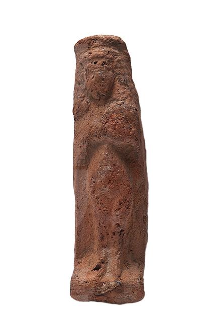 Statuina in terracotta, attualmente priva di ingobbio e decorazione dipinta e dalla superficie alquanto consunta, raffigurante una donna nuda, stante, che regge tra le braccia un oggetto rotondo (forse un tamburino a telaio rotondo). La statuina, ricavata da una matrice singola, evidenzia la figura femminile su uno sfondo e una piccola base quadrangolare sotto i piedi. I dettagli sono scarsamente distinguibili, ma sembra che abbia una gonfia parrucca a treccine, che scende fino alle spalle ed è sormontata da una specie di corona svasata (a forma di modio, ma più allargata). Statuine di questo tipo sono convenzionalmente chiamate "concubine del defunto" e rientrano nel corredo funerario a partire dal Medio Regno. La figura femminile nuda simboleggia la fecondità messa a disposizione del defunto, per favorire la sua rinascita. Tuttavia, il tipo di corona e l'anatomia del corpo, con i fianchi arrotondati, potrebbero far pensare anche a una statuina femminile votiva di epoca Ellenistica.