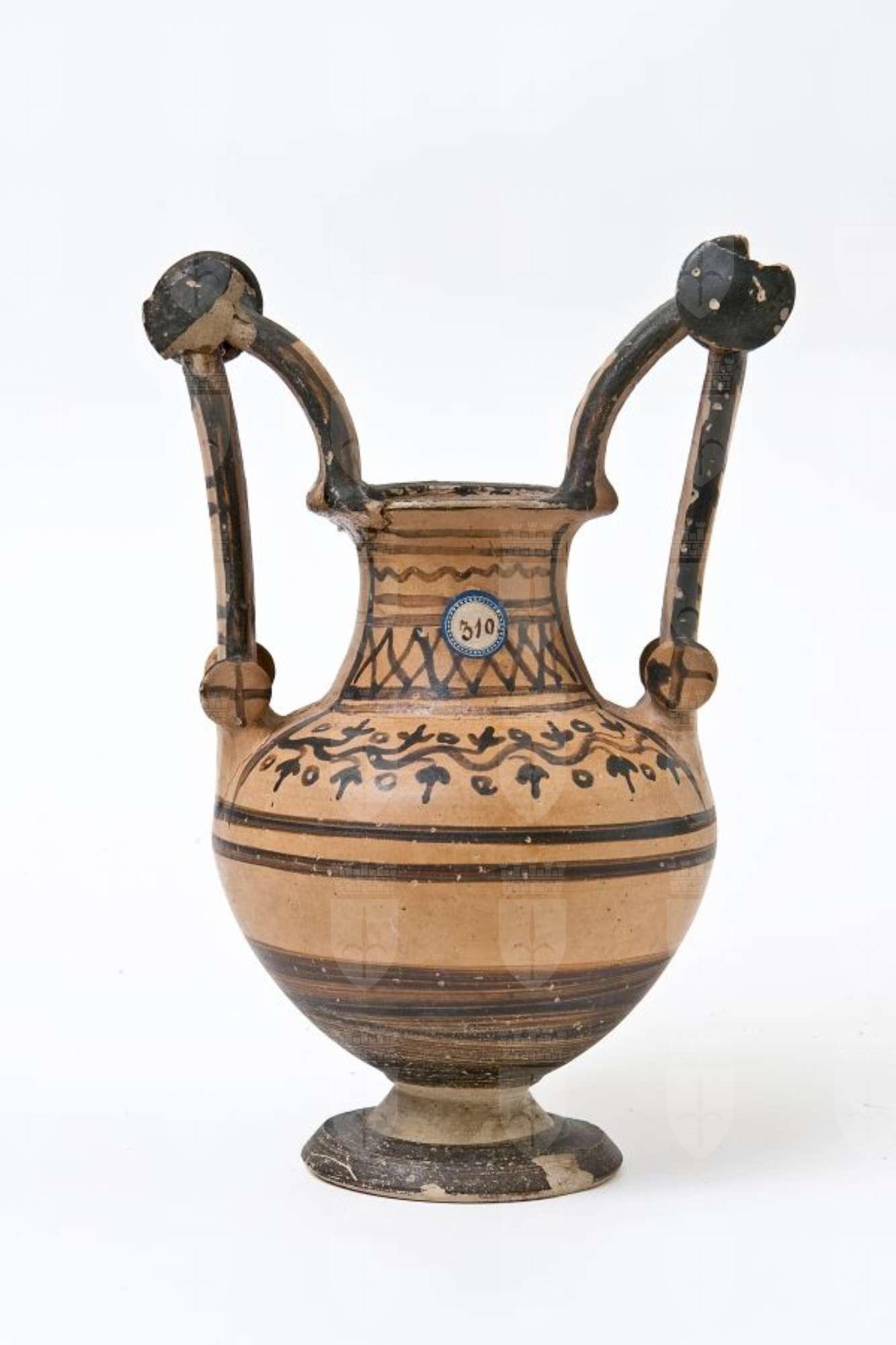 Trozzella in ceramica messapica. Orlo estroflesso, alto collo troncoconico, a profilo concavo, corpo allungato a profilo ovoidale, con anse verticali sormontanti, impostate sull’orlo e sulla spalla, provviste di doppia coppia di dischi (“trozze”), di cui quelli superiori sono di dimensioni maggiori; alto piede troncoconico e spalla distinta. Decorazione monocroma in bruno-nerastro su fondo rosso, con piede, interno dell’orlo e anse dipinti in nero-brunastro; sul collo, pannello con linee orizzontali tremule, ovoli e lunghi pendenti; sulla spalla, un ramo d’edera con corimbi su un lato, mentre sull’altro un pannello con al centro un’antefissa a palmetta e linee tremule verticali ai lati. Nella parte inferiore del corpo, fasce parallele; sulle anse, tratti; dischi superiori dipinti, sui dischi inferiori linee incrociate.