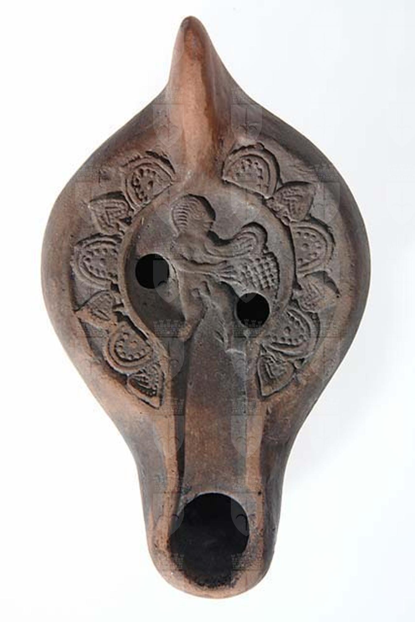 Lucerna Africana. Ansa piena, puntuta. Nel campo concavo, a due «infundibula» obliqui, fluida figura umana di profilo, volta a destra, reggente un grappolo d'uva; il personaggio si identifica con l'esploratore di Canaan. Sull'orlo sei decorazioni geometriche per parte: semicerchi e foglie d'edera alternati. Ansa piena puntuta. Sottofondo piatto con piedino circolare in rilievo, al cui centro due circonferenze concentriche.