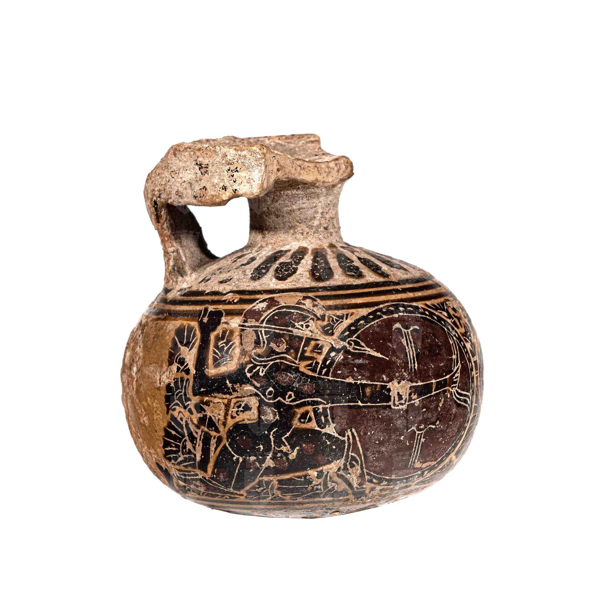 Aryballos corinzio con iguerrieri armati di lancia scudo ed elmo.