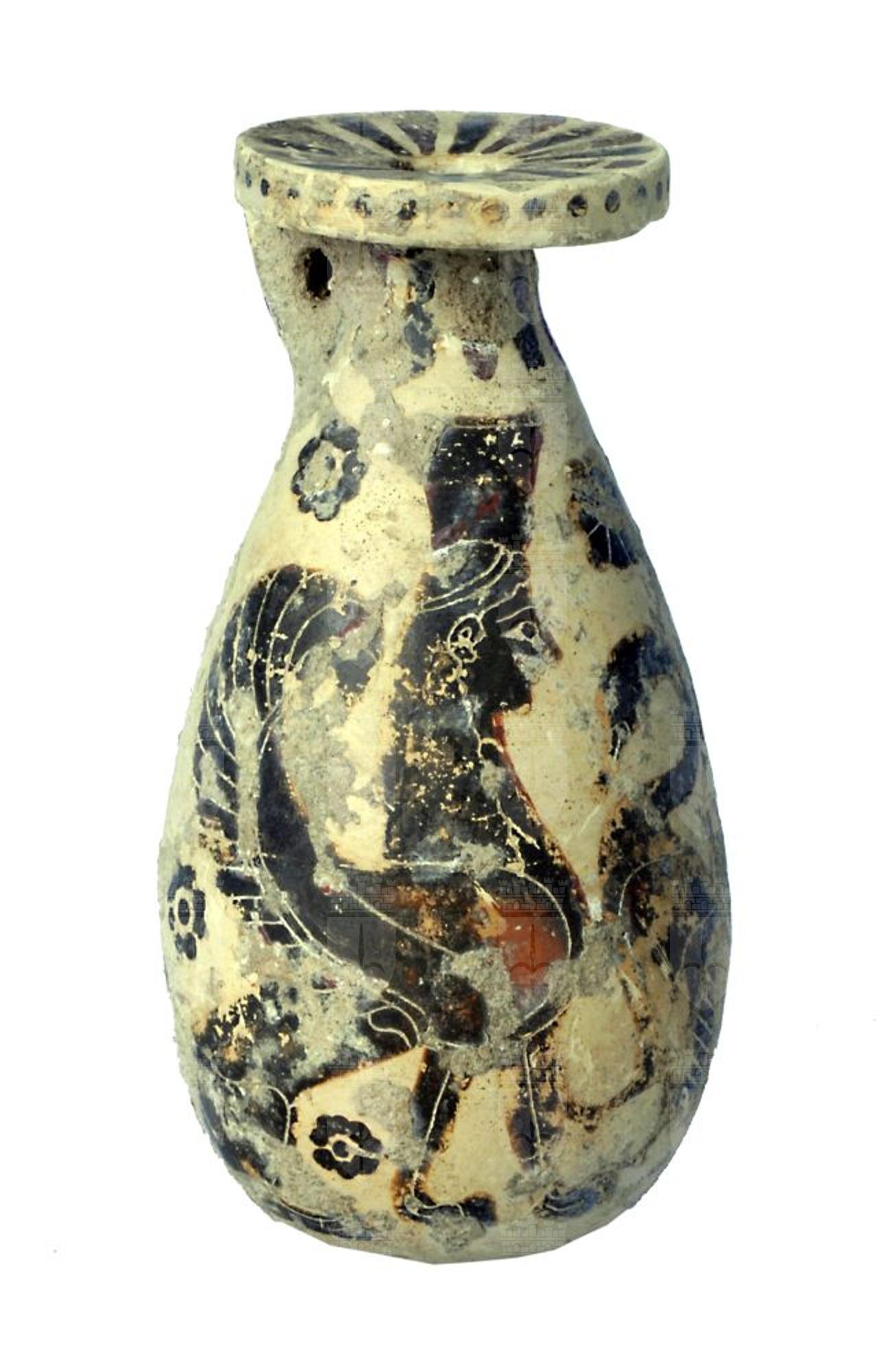 Alabastron piriforme con due animali fantastici (sfingi a corpo di leone, ali e testa femminile) separate da un cigno.