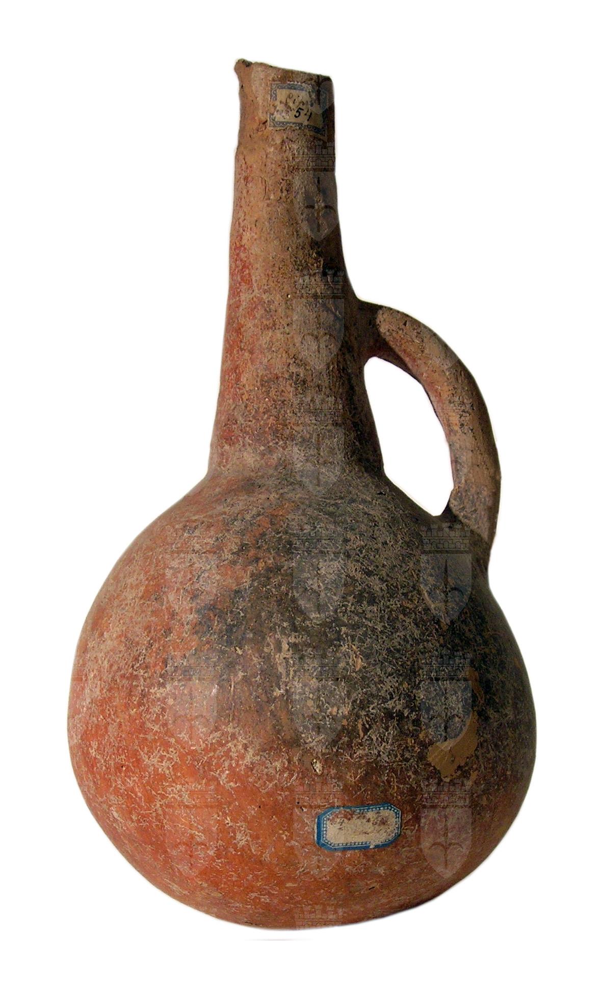 Brocca a corpo sferico verniciata di rosso con chiazze scure e priva di decorazioni. Lungo collo tronconico; ansa a bastoncello (a senzione subcircolare) impostata tra il collo e la spalla. Fondo convesso.