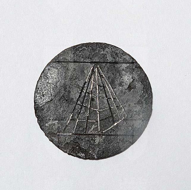 Il piccolo dischetto circolare conserva su ambo le facce la figura di una piramide o analemma per la lettura delle ore con l'indicazione dei diversi mesi dell'anno, rispettivamente alla latitudine di Roma (RO) da una parte, e di un'altra città forse Ravenna (RA) dall'altro. Per venir usato doveva essere probabilmente inserito in un cilindro di analogo materiale. Tracce d'argento nelle incisioni dell'analemma.