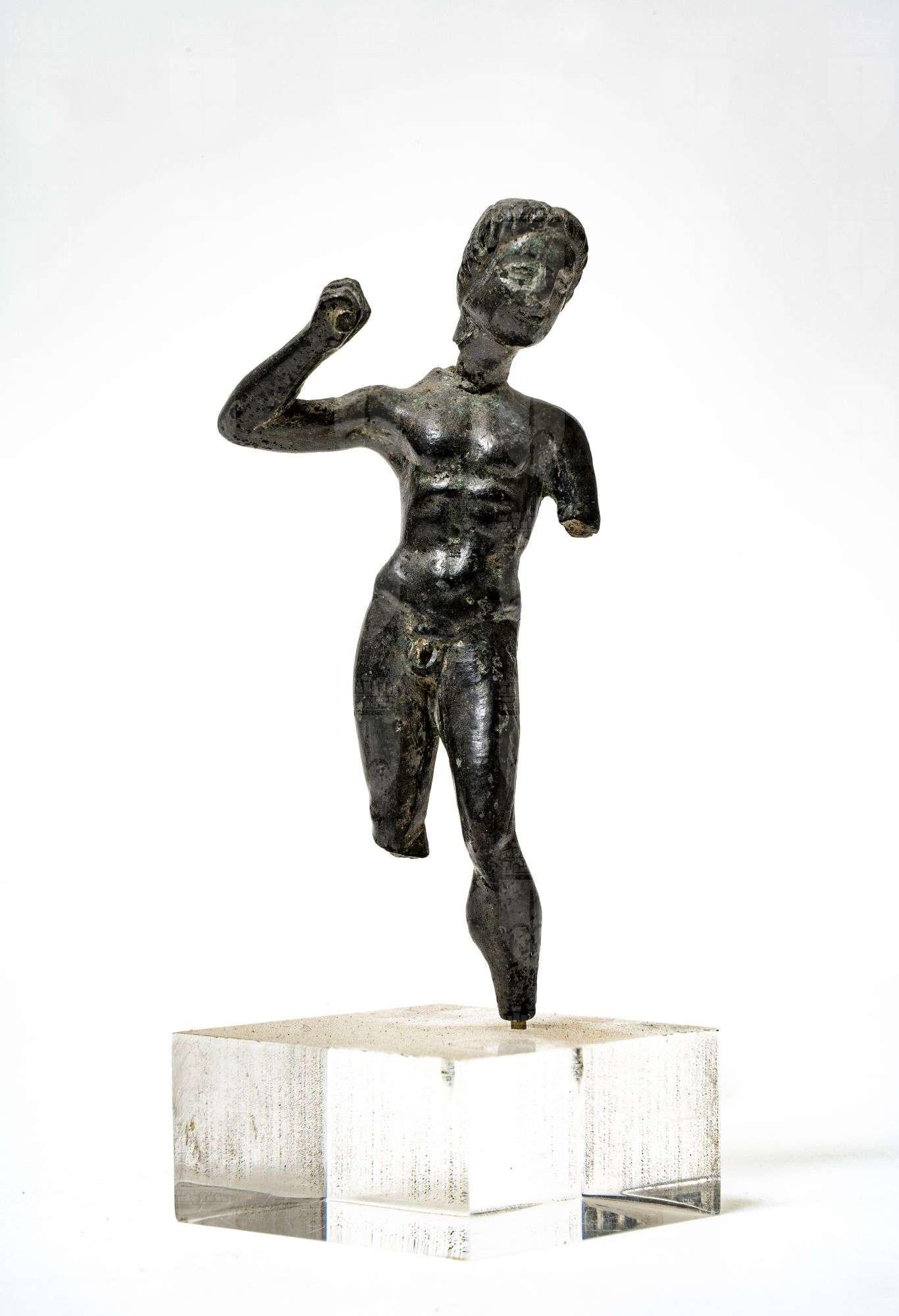 Figurina ignuda d'Ercole il braccio è alzato con in pugno un manico di clava. Capelli striati a cono. Arcaismo nel volto. Raffigurato in movimento vivace, col capo rivolto a sinistra.