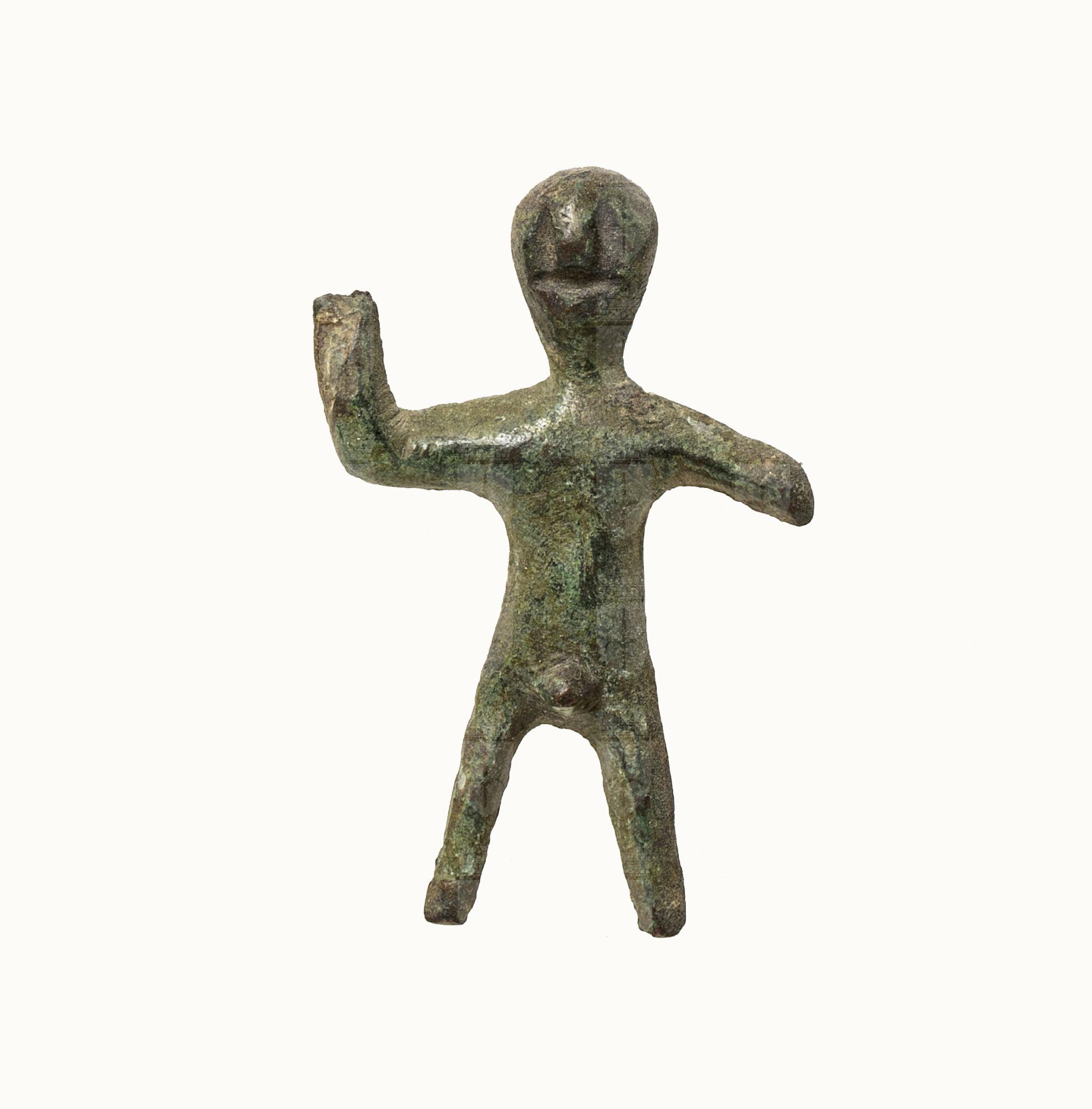Figurina di uomo ignudo, itifallico, col braccio destro piegato e sollevato che probabilmente doveva brandire una lancia. Il sinistro è molto più corto dell'altro. La testa è ovoidale e ha gli occhi e la bocca resi mediante due tacche verticali che incrociano un breve solco orizzontale, dando così luogo anche alla sporgenza del naso. Al momento questo modo di rendere i lineamenti rappresenta un unicum.