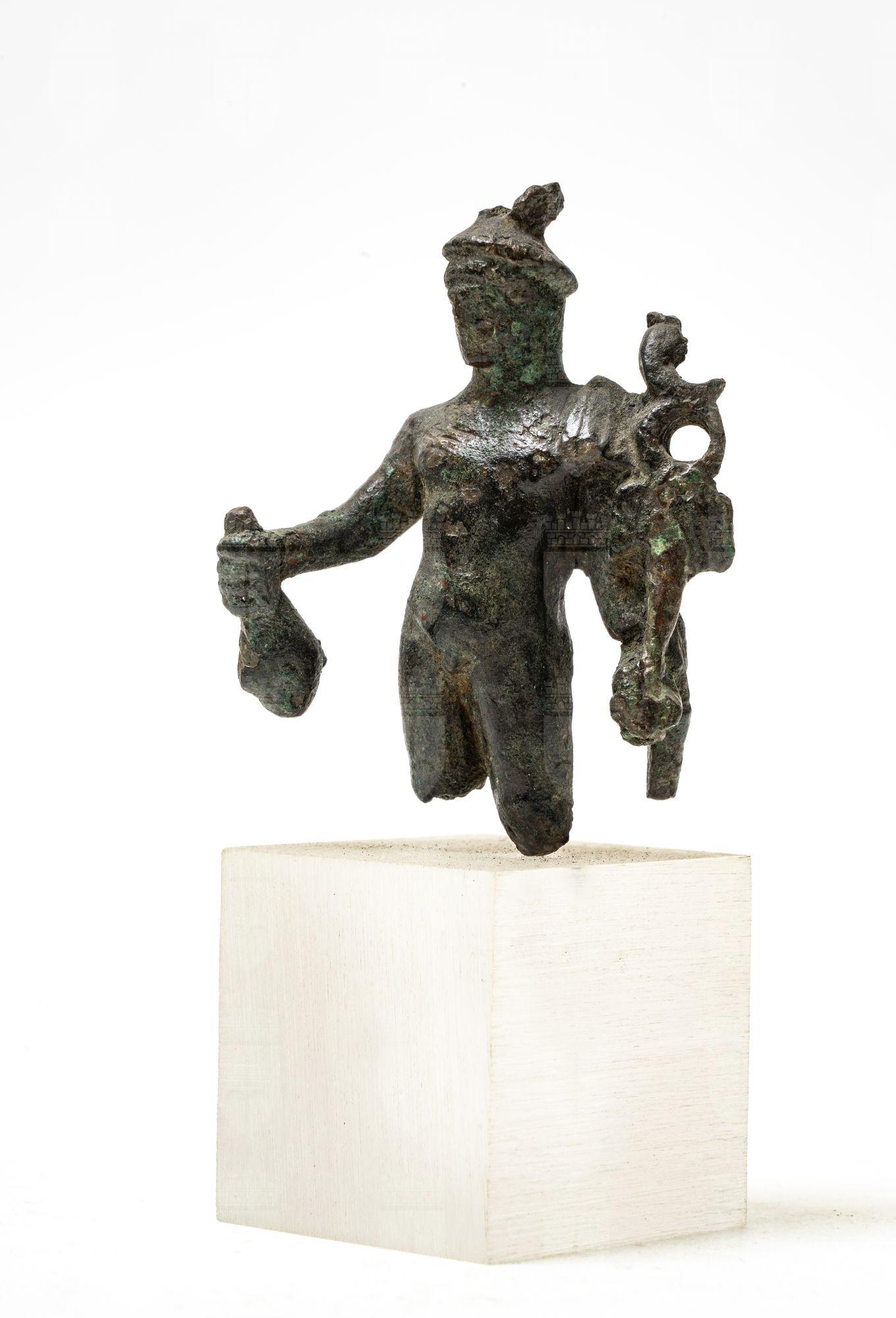 Statuetta di Mercurio seminudo: la sua "paenula" è allacciata sulla spalla sinistra ricadendo sul braccio e di lato in drappeggi. La mano destra regge una borsa, la sinistra il caduceo. Sul capo il petaso munito di ali.