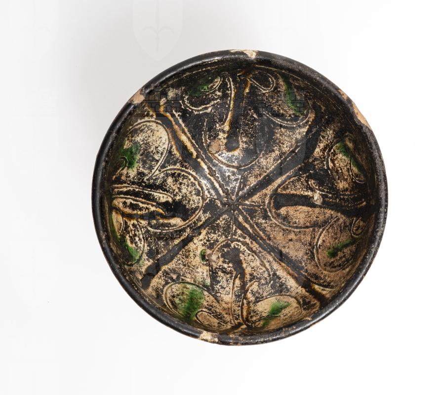 Ciotola emisferica con piccolo piede a tacco. Con all'interno decoro quadripartito inciso e dipinto in nero e verdea motivo vegetale con foglia centrale verticale e due laterali ricurve; all'esterno gocciolature sull'ingobbio chiaro che copre l'intera superficie.