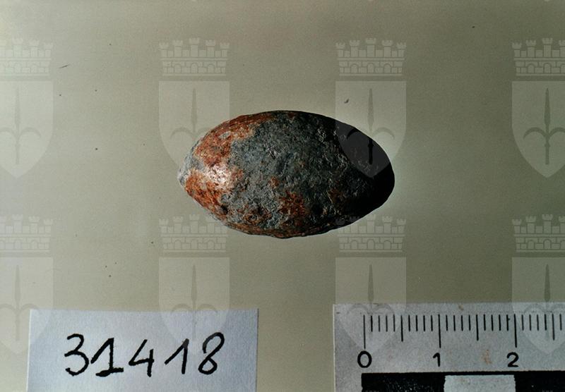 Ghianda anepigrafe, tipo Ic, forma ovoidale con ossidazione ferrosa e ampie abrasioni.