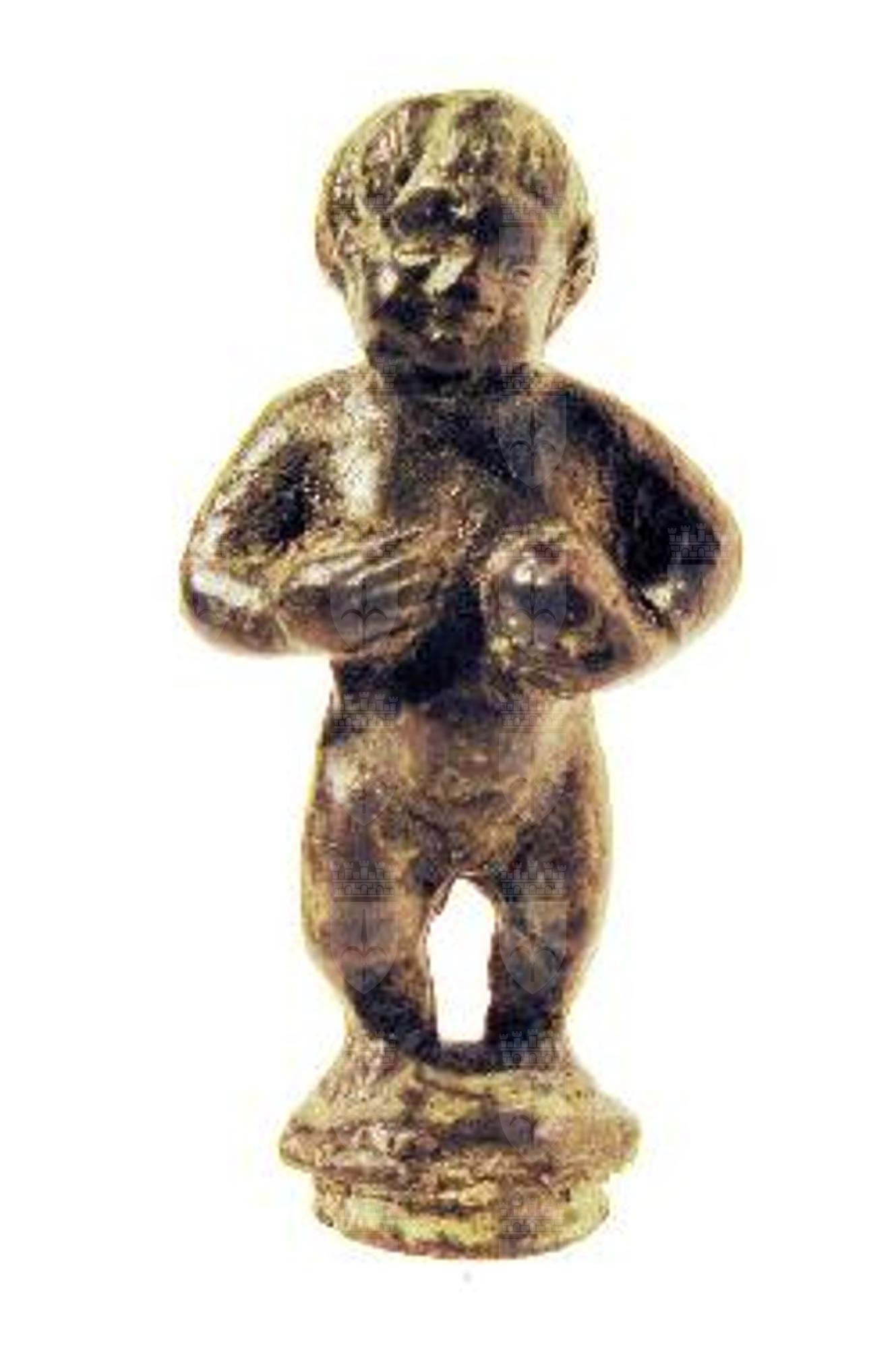 Figuretta di bimbo nudo, ritto sulle gambe un po' arcuate, le braccia piegate al petto. Nella mano sinistra stringe una palla. Il capo è piegato un po' a sinistra, sproporzionato rispetto al corpo. È sorretto da un basso piedistallo bronzeo originario. Il lavoro confuso e la mancanza di confronti tipologici precisi lasciano qualche sospetto.