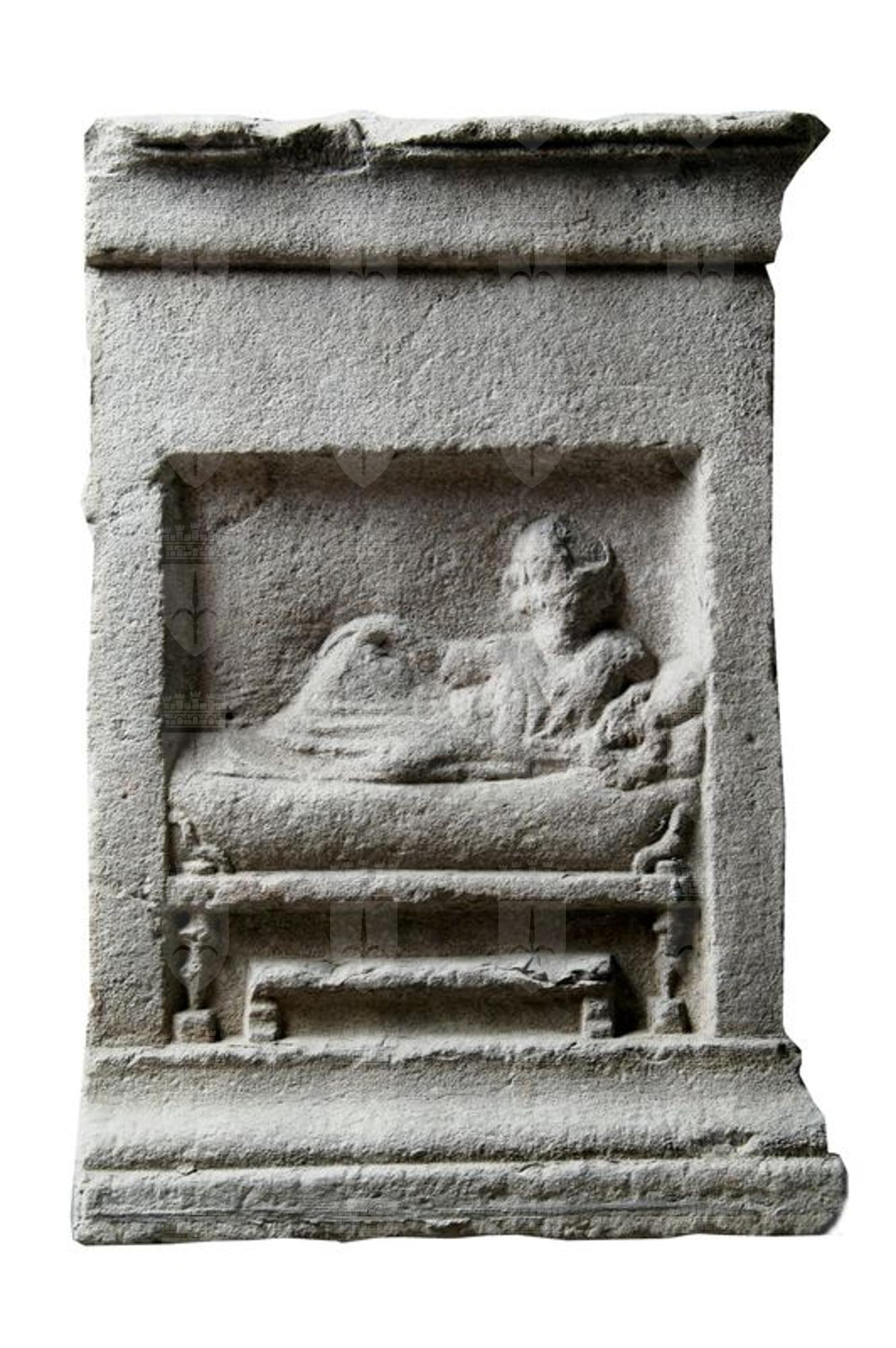 Stele rettangolare con zoccolo e coronamento modanato e sulla fronte entro un riquadro ribassato è realizzata a rilievo la figura umana adagiata su klyne: i volto è completamente abraso e indossa una veste a ricche pieghe
