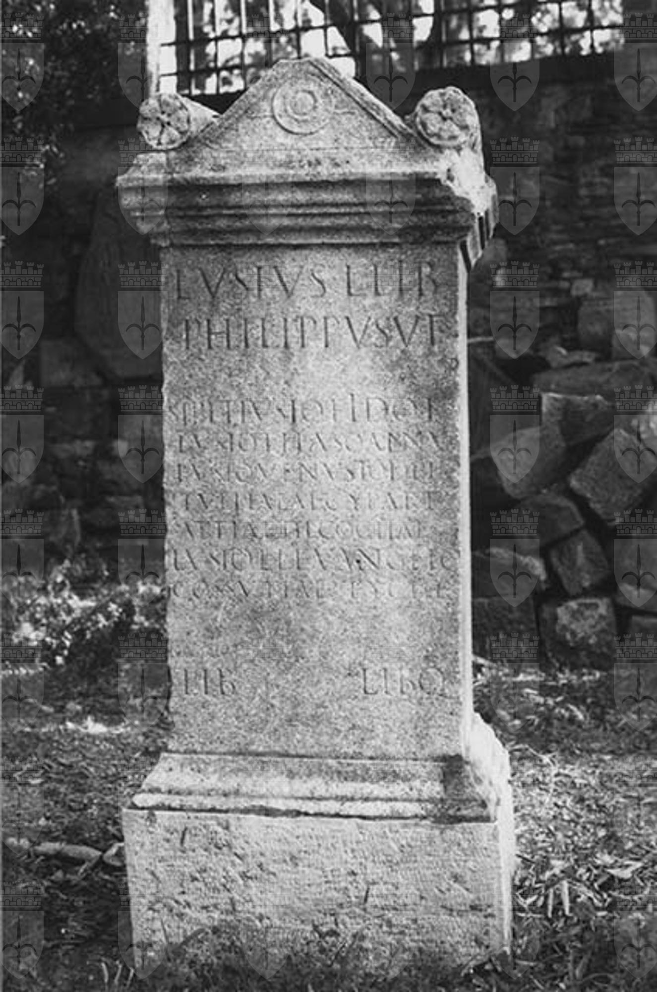 Blocco unito; Dado liscio; Iscritta fronte e retro; Base modanata; Coronamento modanato a timpano decorato da patera. Alle sue estremità sono presenti due pulvini lisci con volta a fiore; Il liberto (schiavo liberato) Lucio Usio Filippo realizza il monumento funebre, mentre è ancora vivo, per sé e per altri membri della famiglia. Ritrovamento presso Trieste, Campanile di San Giusto nel 1842; Acquisizione dal 1842; Conservato nell'Orto Lapidario, I ripiano, oggi risiede nel Lapidario Tergestino, Castello di San Giusto.
