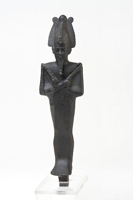 Statuina in bronzo che raffigura il dio Osiride mummiforme con in capo la corona bianca dell'alto Egitto affiancata da due piume di struzzo. Sulla corona dell’Alto Egitto è presente un cobra (l’ureo). Il dio è stante, con la barba divina sul mento e con le mani incrociate sul petto, che reggono lo scettro-heqa nella mano sinistra e il flagello-nekhekh nella destra. Sotto i piedi vi è un perno per l'infissione in una base.