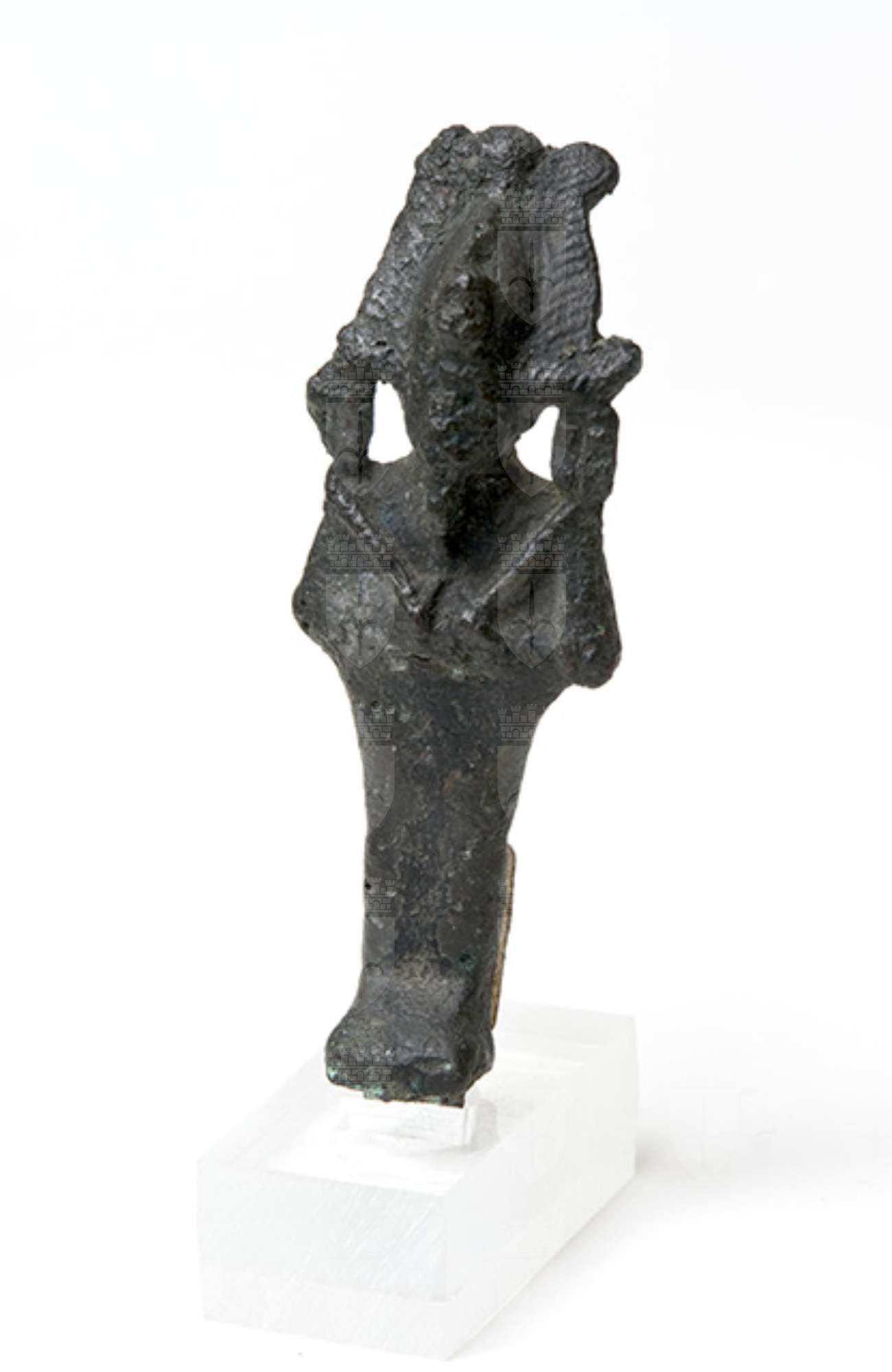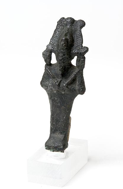 Piccolo bronzetto che raffigura il dio Osiride mummiforme. Ha sul capo la corona atef, composta da due corna ondulate d'ariete su cui poggia la corona bianca dell'alto Egitto affiancata da due piume di struzzo. Sul davanti della corona è presente un cobra (l’ureo), altri due urei poggiano sulle spalle. Il dio è stante, porta la barba divina sul mento e ha le mani incrociate sul petto, che reggono lo scettro-heqa nella mano sinistra e il flagello-nekhekh nella destra. I dettagli sono scarsamente leggibili a causa della corrosione superficiale.