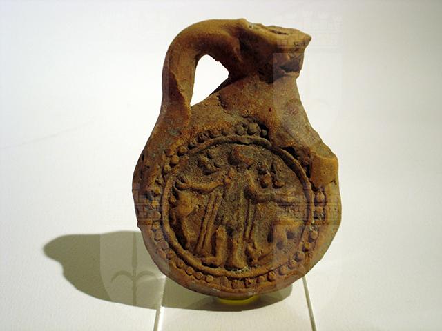 Ampolla piatta in argilla nocciola rosata, depurata, priva di un’ansa, con scheggiature sul bordo del collo e sull’ansa superstite. Incrostazioni sulla superficie. Sulle due facce dell’ampolla, entro un medaglione piatto delimitato da un bordo perlinato che circoscrive un anello a rilievo, vi è la medesima scena: San Menas, con l’abito militare, in atteggiamento di preghiera. La testa è inquadrata da una croce greca sulla destra e da una croce a forma di fiore quadripetalo sulla sinistra. Ai piedi del santo, i due cammelli sono di dimensioni diverse (quello sinistro è più piccolo e senza coda).