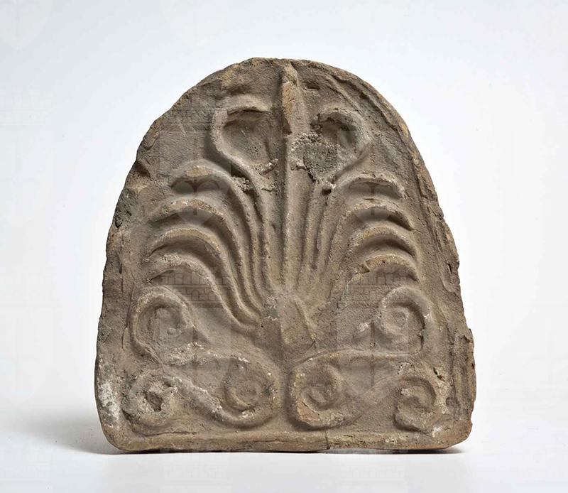 Argilla di color beige, in frattura di colore rosato. Rare tracce di biancastro su petali, volute e sfondo. Un listello funge da contorno della lastra; alla base vi sono due elementi terminanti alle estremità in volute, da cui spuntano altri due elementi, che si sviluppano orizzontalmente e terminano in volute, e un triangolo; da questo spuntano undici petali sottili e incavati: il centrale è dritto fino al bordo superiore, i due laterali a questo si curvano verso l'interno, i restanti verso l'esterno.