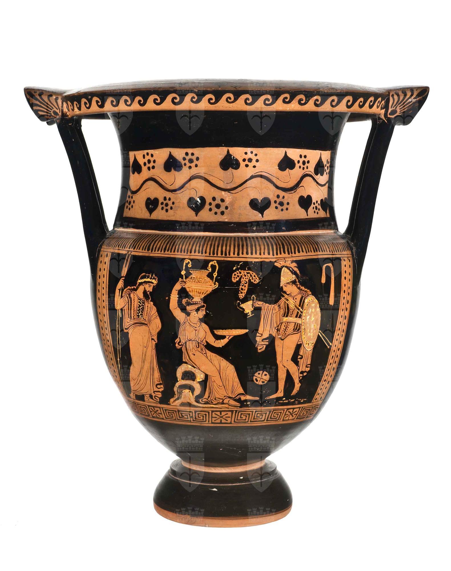 Cratere a colonnette apulo a figure rosse, decorazione a meandri, onda marina corrente e serto d'edera sul collo. Lato A: Scena di offerta: uomo stante con barba e diadema, ammantato e di aspetto regale, si sostiene con due lance; una donna seduta con nestoris sul capo e patera in mano e un guerriero con kantharos, scudo e lance in mano. Lato B: tre giovani ammantati con patera, phialai e palle.