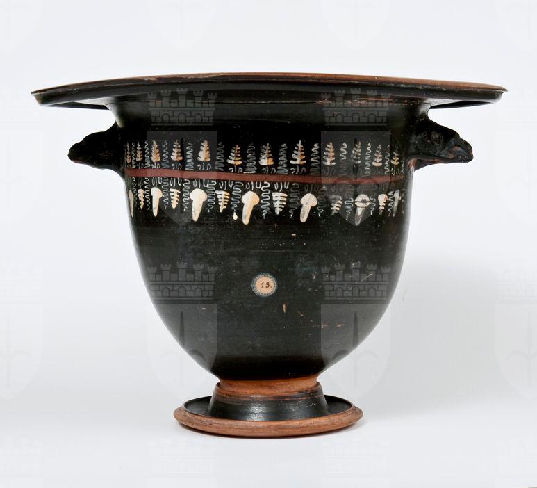 Labbro espanso e revoluto modanato, orlo estroflesso, profonda vasca ovoidale, con prese a protome leonina ben modellate, bassa gola di raccordo, piede campanulato Lato A: tralcio di vite, con stelo ln rosso amaranto, grappoli, pampini, viticci e germogli in bianco e giallo.