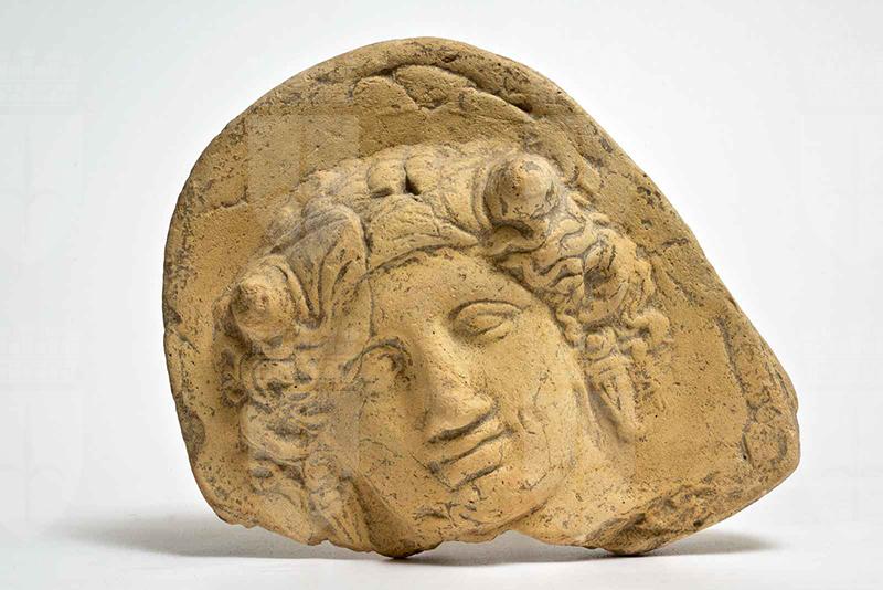 Argilla di color beige, in frattura argilla rosata. Mancante nell'angolo inferiore sinistro fino al mento e all'orecchino. Il volto è quasi tondo, gli occhi leggermente infossati e le palpebre spesse, il naso dritto, le labbra carnose e la bocca chiusa. I capelli sono poco conservati, si notano le corna bovine che spuntano dalla sphendone e gli orecchini.